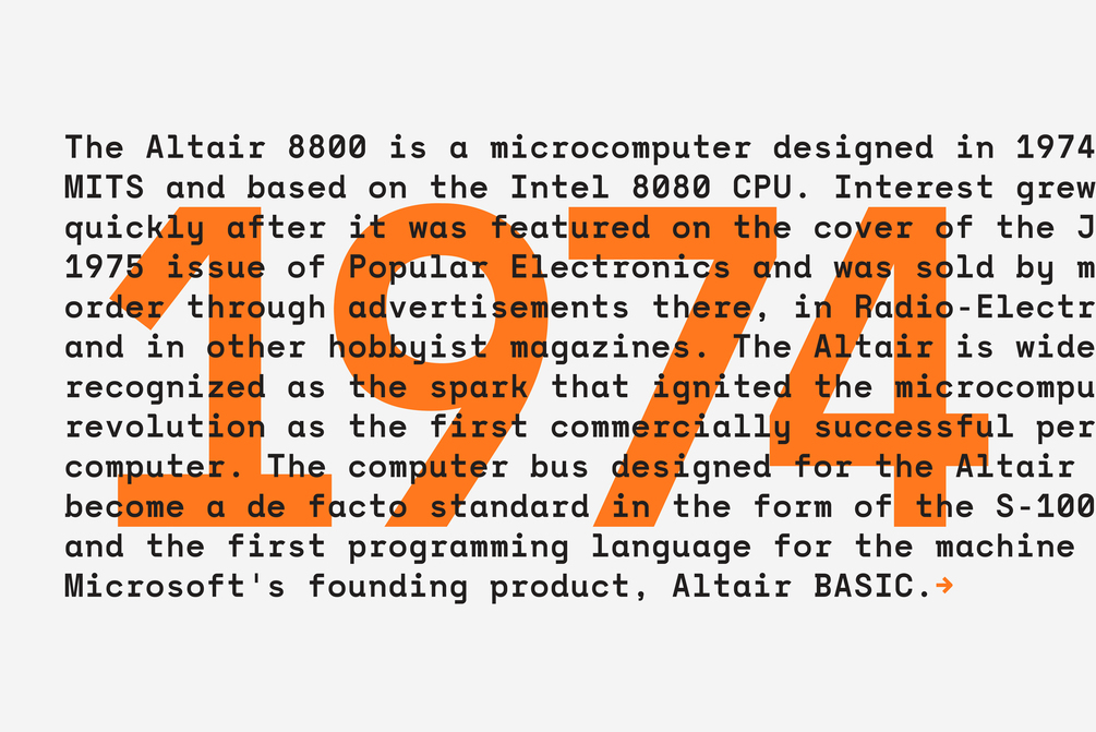 Monograf was originally designed as fixed-width monospaced font which has 2 weights (Regular and Bold). Monograf Text is a derived style of Monograf with proportional spacing and well-balanced kerning to make the text easier to read and look optically balanced.